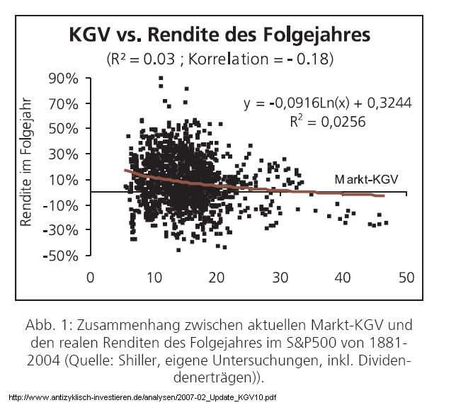 Dem Argument, dass der Gesamtmarkt mit einem KGV von X oder Y günstig oder teuer ist und deshalb im nächsten Jahr steigen oder fallen müsste steht keine wissenschaftliche Fundierung gegenüber. Das 1-Jahres KGV des Gesamtmarktes hat wie man an der folgenden Grafik sehen kann nur eine sehr begrenzte Aussagekraft über die Kursentwicklung im nächsten Jahr: