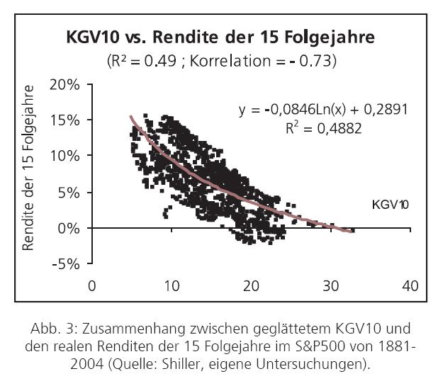 Eine andere Sichtweise – die allerdings am breiten Markt weniger bekannt ist (weil für kurzfristige Schlagzeilen zu langfristig) ist die Aussagekraft des sogenannten KGV10 nach Shiller. Das KGV10 bestimmt sich als inflationsbereinigter Durchschnittsgewinn von zehn Jahren zum aktuellen Kurs des Gesamtmarkts. Setzt man das KGV10 ins Verhältnis zu den Renditen die in den darauffolgenden 15 Jahren real (vor Inflation) erzielt werden, erhält man einen sehr signifikanten Zusammenhang über Bewertung und erzielte Renditen.