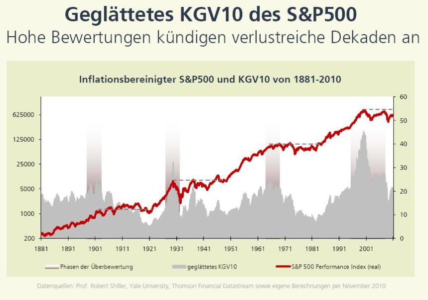 Insbesondere ein KGV10-Stand von über 25 war in der Vergangenheit immer von schwierigen Börsenzeiten in den nächsten Jahren gekennzeichnet. So war dies ab 1900, 1929, 1965 und ab 2000 der Fall.