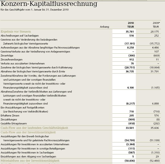 Fazit: Die Berechnung des operativen Cashflows sollte um den Wert der zugekauften biologischen Vermögenswerte bereinigt werden. Als Ergebnis erhält man mit 19,3 Mio. EUR einen Wert der -42% niedriger ist als im Geschäftsbericht gezeigt und konsistent mit dem “bereinigten” Ergebnis ohne Neubwertungen. Mit ca. 1,34 EUR pro Aktie operativem Cashflow für 2010 wäre damit schon ein sehr starkes Wachstum in den nächsten Jahren nötig um den aktuellen Kurs zu rechtfertigen.