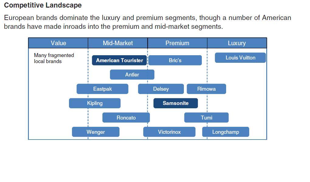 Our biggest global competitor in the travel goods category is Rimowa, a German company. We also compete with Samsonite in Europe, the Middle East, Africa and Asia-Pacific. In the premium luggage and business cases category, we compete with Bally, Dunhill, Ferragamo, Gucci, Louis Vuitton, Montblanc, Porsche and Prada. In the business case category, we also compete with smaller brands in specific markets. In the U.S., our main competitors are Victorinox and Briggs and Riley. In Europe, the Middle East and Africa, our key competitors are Mandarina Duck and Piquadro. In the Asia-Pacific region, competition is fragmented. In Japan, our two key competitors are Porter and Ace Brand. We also compete with Coach across the luggage, business cases and accessories categories.