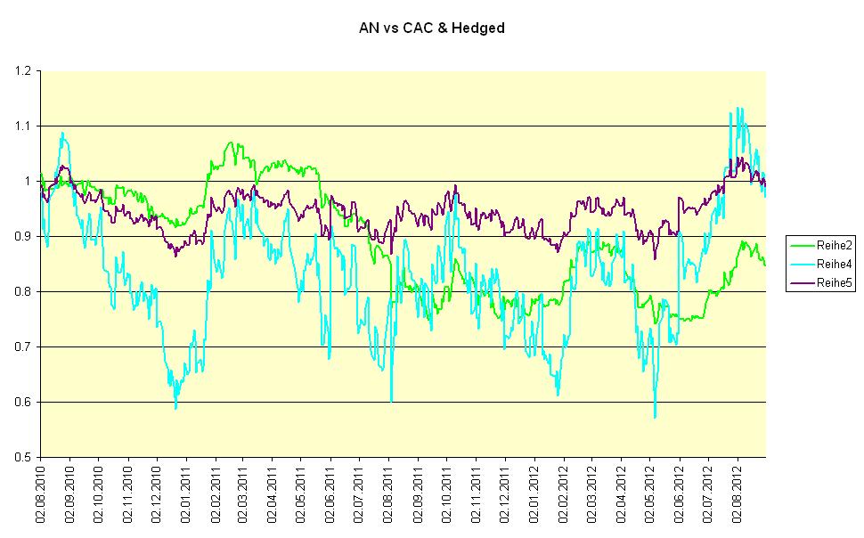 In theory, one would implement a short position according to the beta of the stock to the CAC 40. Adjusted Beta has been quite stable to the CAC with 0.67, Raw Beta is at around 0.48.