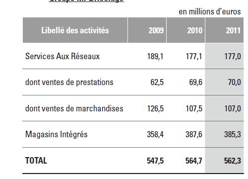Mr. Bricolage has a very different business model than the two German listed companies, Praktiker and Hornbach. Mr. Bricolage does run its own stores, but the majority of “gross sales” runs through Franchise partners which carry one of the Mr. Bricolage brands. Mr. Bricolage itself shows sales of ~560 mn EUR in 2011, “network sales” have been something like 2.3 bn.