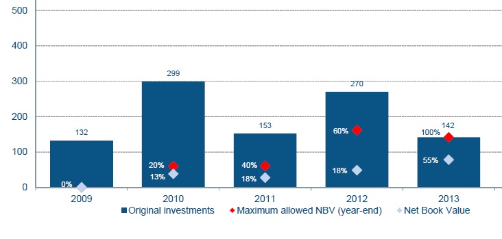 Die Amortisierung wird im Übrigen nach Fixen Mindestprozentsätzen gemacht. Mindestens 40% im ersten Jahr, dann mind. 3x 20%, nach 4 jahren ist komlett abgeschrieben. In den Vergangenen Jahren wurden i.d.R. mindesten 2 mal die Investitionen verdient, im Schnitt 2,5 mal.