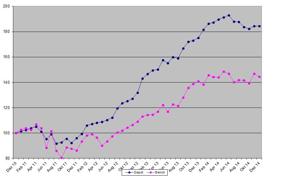 In 2014, the portfolio perfomed 5,42% vs. 2,37% for the Benchmark (Eurostoxx50 (25%), Eurostoxx small 200 (25%), DAX (30%),MDAX (20%)). This is the 4th year in a row with an outperformance but such a small difference is rather arbitrary, so nothing to get excited.