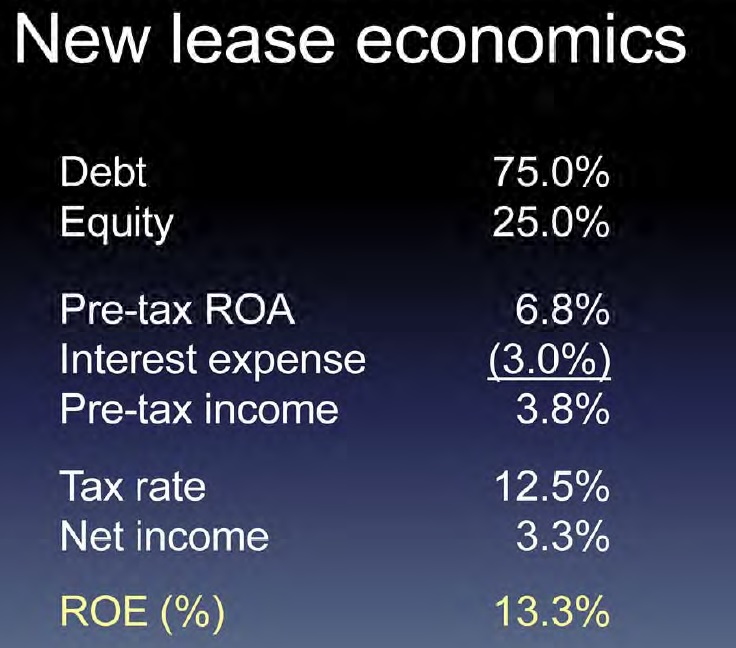 So AerCap is funding at a spread of 2,75% vs. LIBOR. With the 10 year USD LIBOR at 2,00%, funding would be way more expensive than the 3% assumed by Einhorn. Maybe the fund floating rate, but then the whole company would rather be a bet against rising interest rates than anything else. On a “like for like” basis without structural interest rate risk, I don’t think AerCap will generate a double-digit ROE at current spreads.