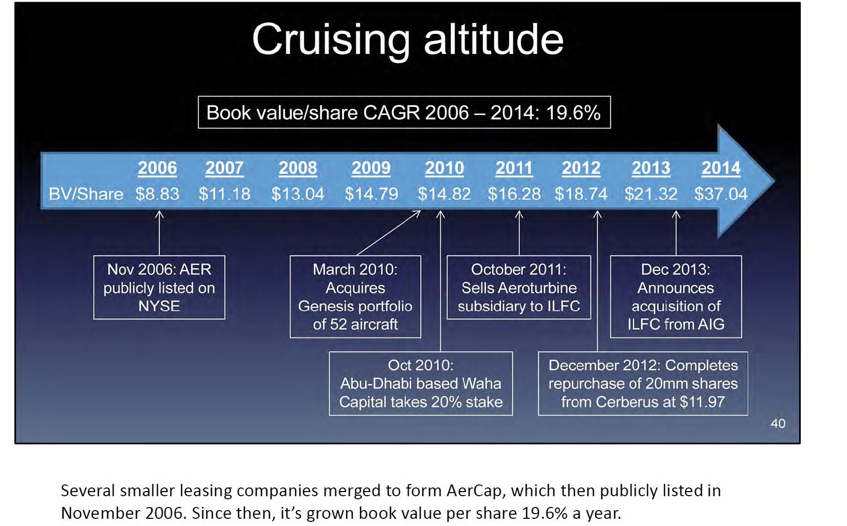 So how is this to be interpreted ? Well, clearly it was a smart move from AerCaps management to pay with its owns shares at such a nice price. On the other hand, one should clearly not mistake this a a recurring kind of thing. I would not use the historic 20% p.a. increase in ROE as expectation for the future but rather something like 13% or so in the past.