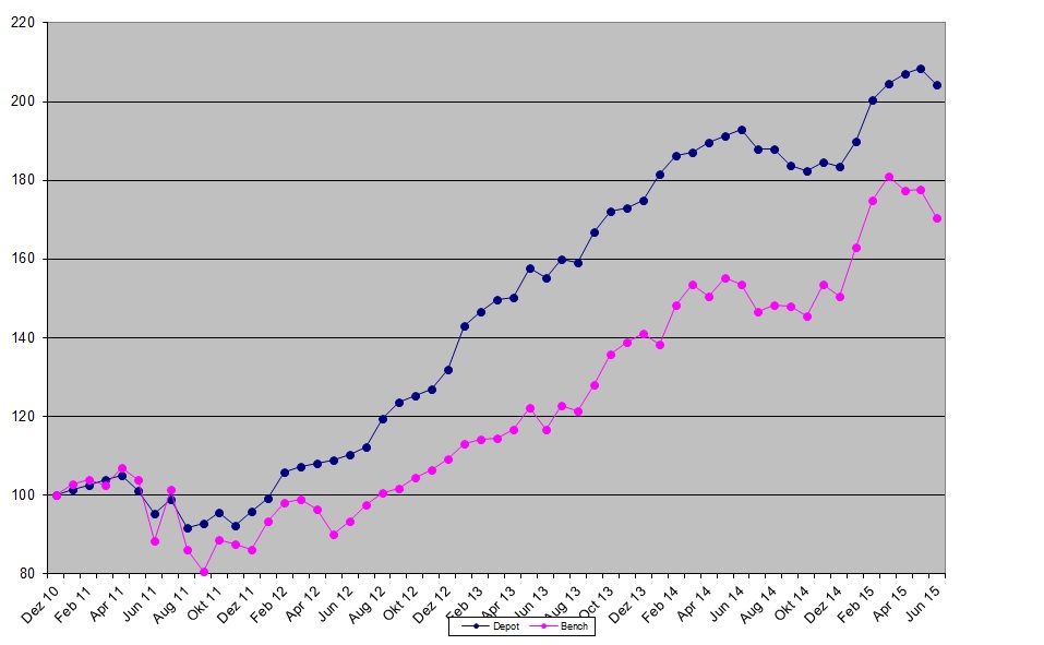 Compared to the first quarter, the second quarter was in relative terms much better than the first quarter. The Benchmark (Eurostoxx50 (25%), Eurostoxx small 200 (25%), DAX (30%),MDAX (20%)) actually lost -5,8% in the second quarter, whereas the portfolio remained almost unchanged with -0,1%. YTD the score is now 13,2% for the benchmark vs. 11,4% for the portfolio.