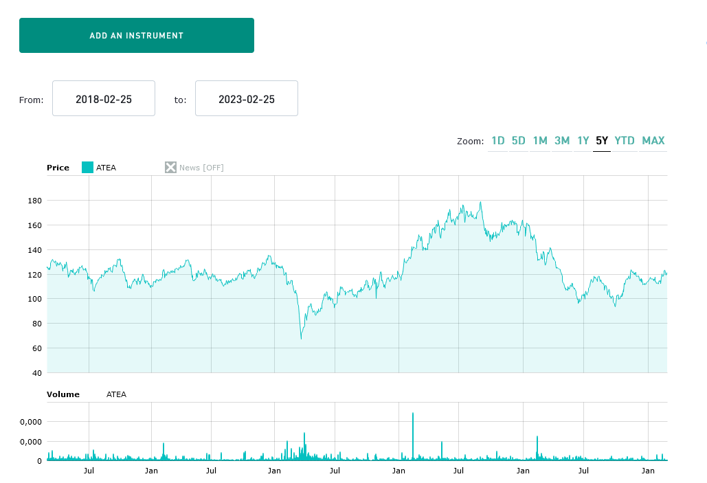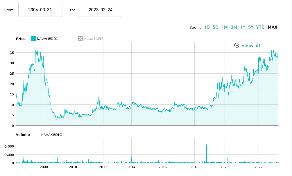 Navamedic is a 57 mn EUR market cap “Nordic pharma company supplying hospitals and pharmacies with pharmaceutical and medical nutrition products”. The company has been loss making for many years but, surprisingly, became profitable in 2022. This is reflected in the share price which is now close to ATH: