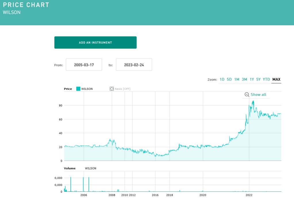 Wilson is a 270 mn EUR market cap shiping company that operates ~130 smaller vessels. As other shipping companies, they trades at very low valuations, in this case 3,5x 2022 P/E. Operating margins have increased from 2,5% to 40% in 2022. I have no idea how sustainable these margins are, but historically the peak has been around 20% and on average maybe 10-15% with a high volatility. Interestingly, the share price hovered around 20 NOKs for 20 years before going up more than 3x in 2021: