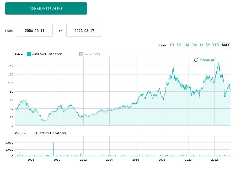 Austevoll is a 1,6 bn EUR fish farmer, which compared to the other fish players so far, is a very established player. Looking at the long term chart we see a relatively good value creation, but quite some volatility: