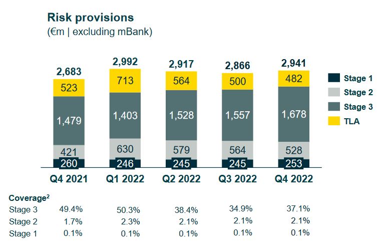 Interestingly, some banks seem to see this very differently and do not prepare themselves for a more harsh climate. Commerzbank for instance, who proudly reported “record results” for 2022 did not increase loss reserves very much in 2022 as shown in this slide from their investor presetnation and seem to cover their existing exposures at a lower level than at the end of 2021: