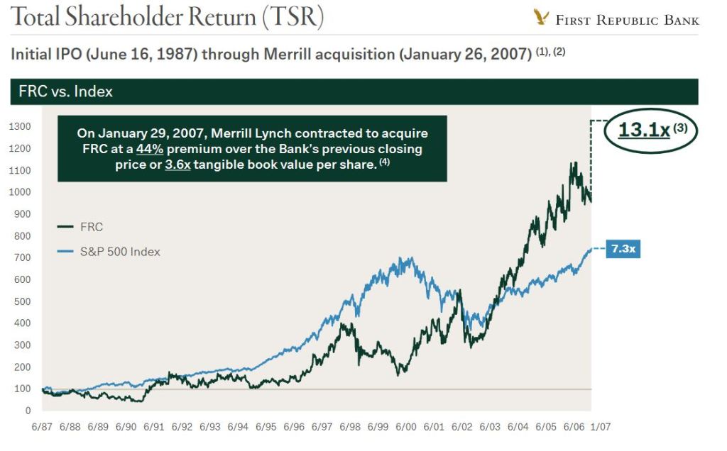 When reading the January invetsor presentation, First Republic looks like an absolute success story, among others, their share price went up 13x since 1987, almost 2x the level of the S&P (i guess ex dividends) which is remarkable for a bank:
