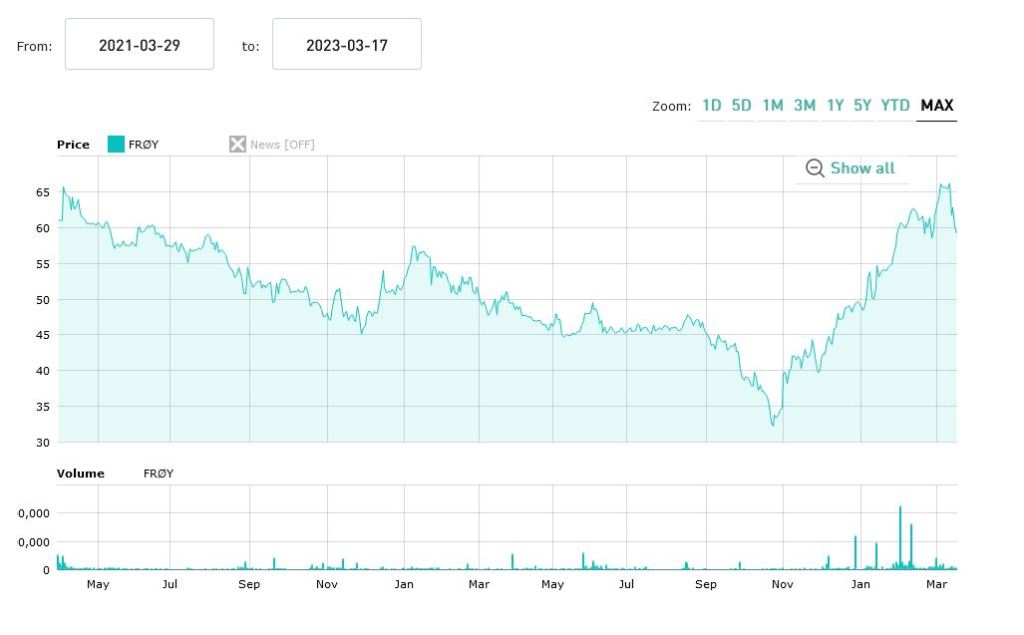 As a one time excepion, I follow up with Froy, a 475 mn market cap stock in which Salmar holds a 72% stake. Froy was IPOed in 2021 and its share price went on a pretty wild ride:
