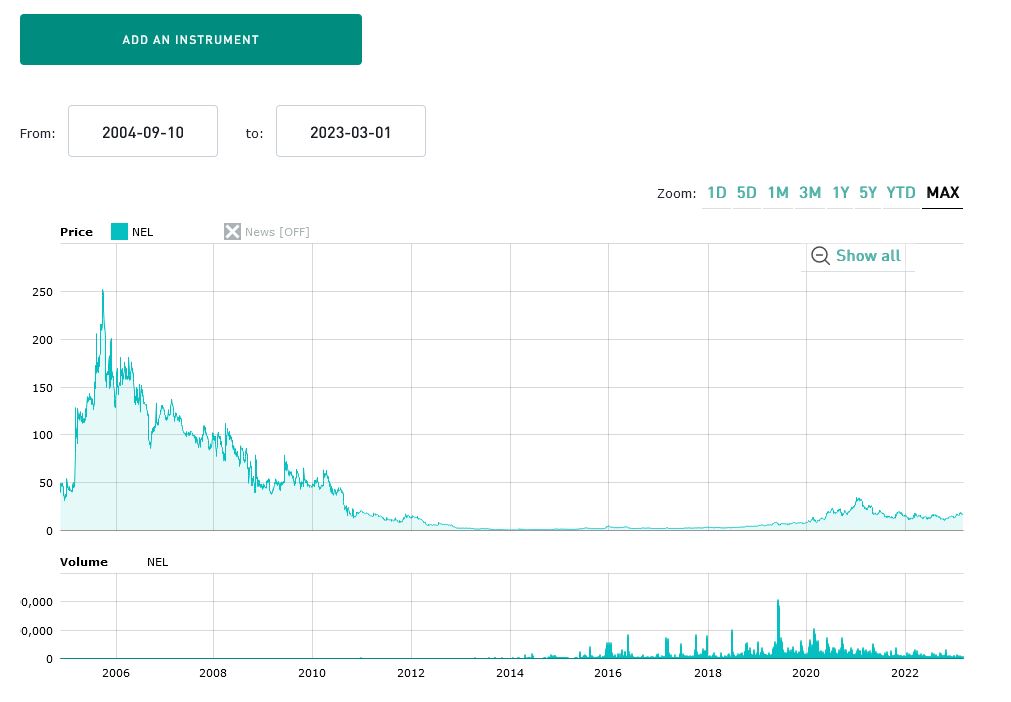 Nel is a (much hyped) 2,2 bn EUR market cap company that is active in the Hydrogen Economy. Nal manufactures Electrolyzers and Hydrogen Filling station equipment. Looking at the chart we can see that Nel has been around for some time and had a frist hype cycle just before the financial crisis: