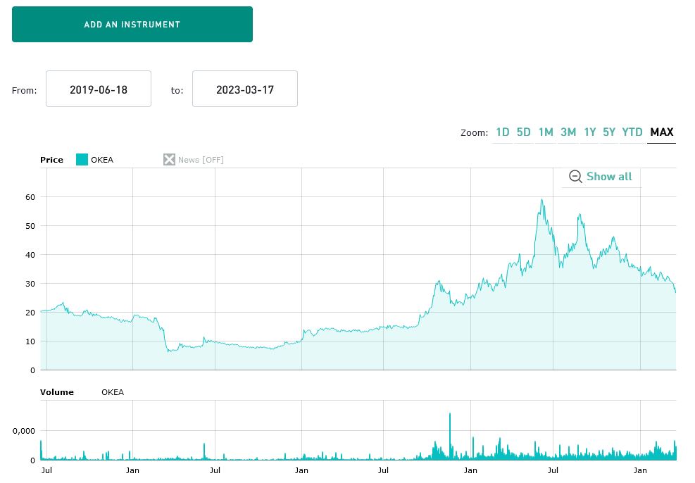 The company was IPOed in 2020 and the share price has been fluctuation widly between 10 andf 70 NOKs: