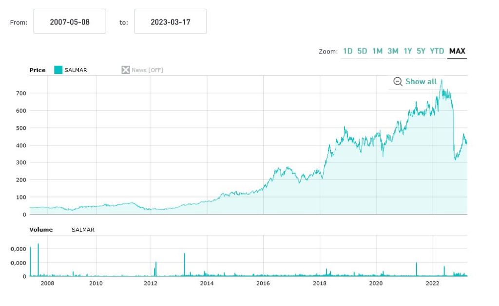 Salmar, with 5,5 bn EUR market cap seems to be one of the “larger fish” among the Norwegian fish farms. The long term share chart looks impressive, despite the obvious hit from the special tax: