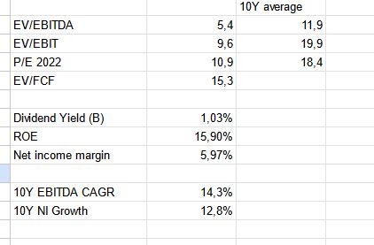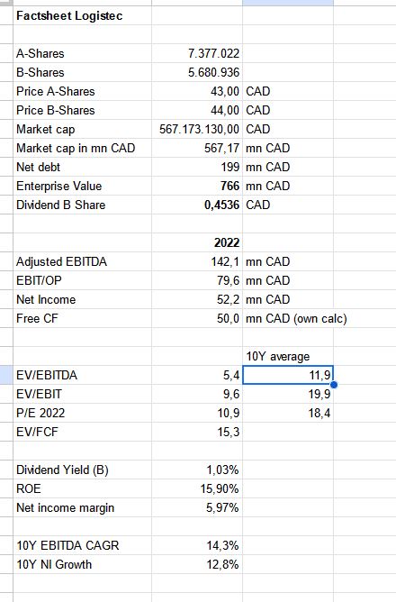 If I account for the “non pure play status” and assume ” the average 10xEV/EBITDA valuation of these peers, Logistec should be roughly worth 105 CAD per share based on 2022 results, however as I mentioned above, this alone would be not enough.