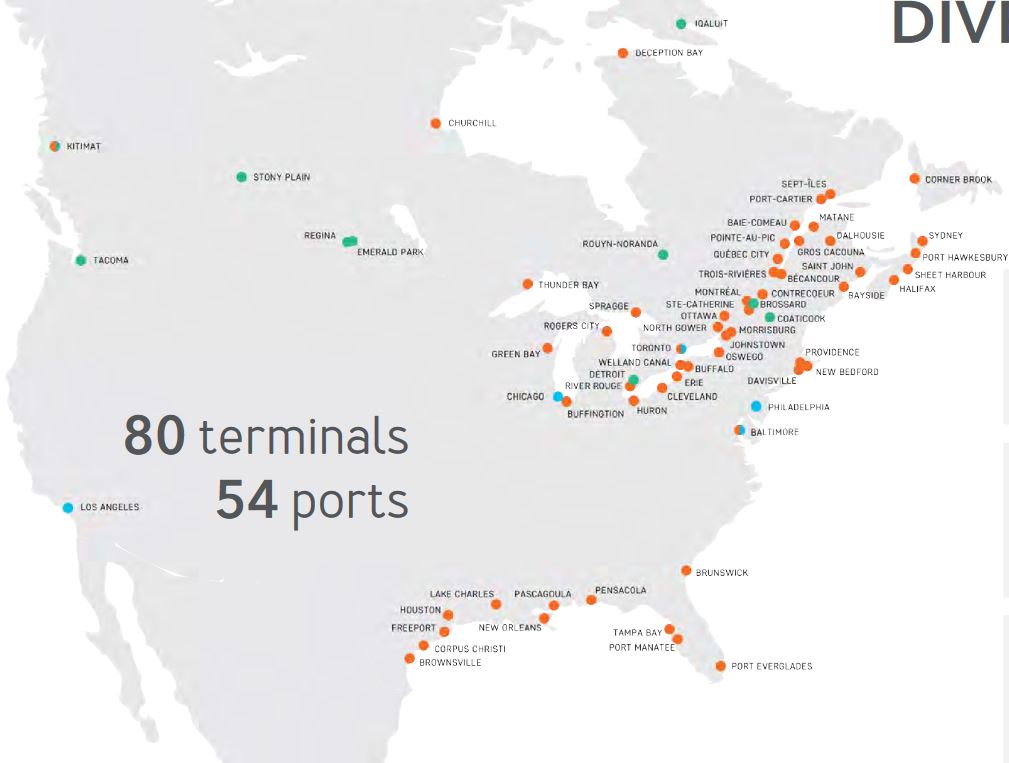 To my understanding, their ports mostly cater to the North American economy and are less dependent on international trade (Asia, or Europe) with the exception of the Tremont Joint Venture. Typical cargo types are for instance wood pellets, grain (Bulk) or parts for wind turbines (break Bulk). This is a picture of a typical bulk terminal: