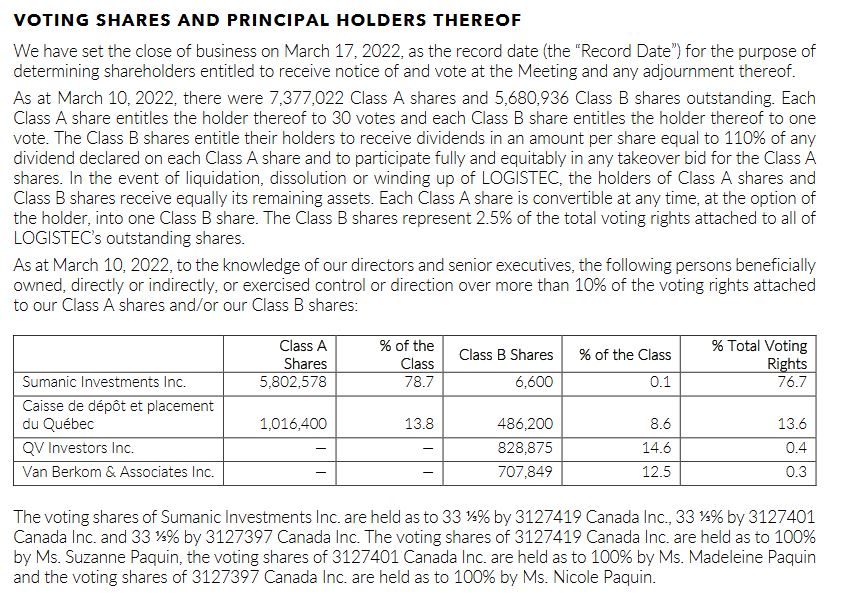 Below is an overview of Logistec’s share structure which consists of ~7,4 mn Class A shares and 5,7 mn B shares. The A shares, which are held mostly by the three Paquin sisters, have 30 votes, the B-shares however have a right to 1,1x the A shares dividend and a tag-along right in the case of a company sale-