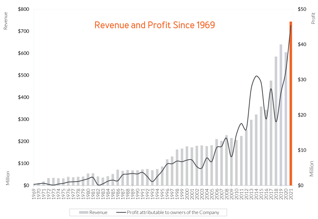 One of the things that actually pulled me towards the company was the fact that they issue this 54 year chart of sales and profits on their website (until 2021):