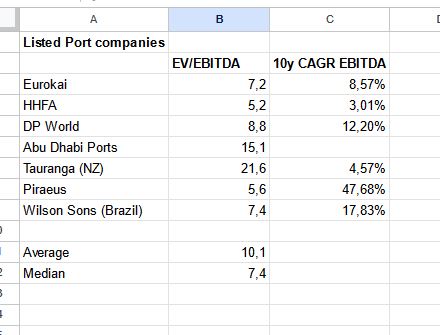 Back then, valuation ranges for Terminal/port assets have been somwhere between 13-20x EV/EBITDA, which could be a, little bit lower now ith higher interest rates.