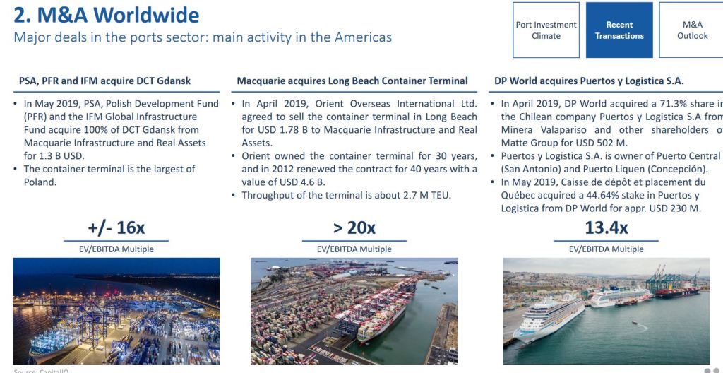 In the past, with lower interest rates, ports have been valued quite high. This is a slide that shows some M&A transaction in the ports sector in the year 2019 with respective EV/EBITDA mutliples that are commonly used as the valuation measure for infrastructure assets: