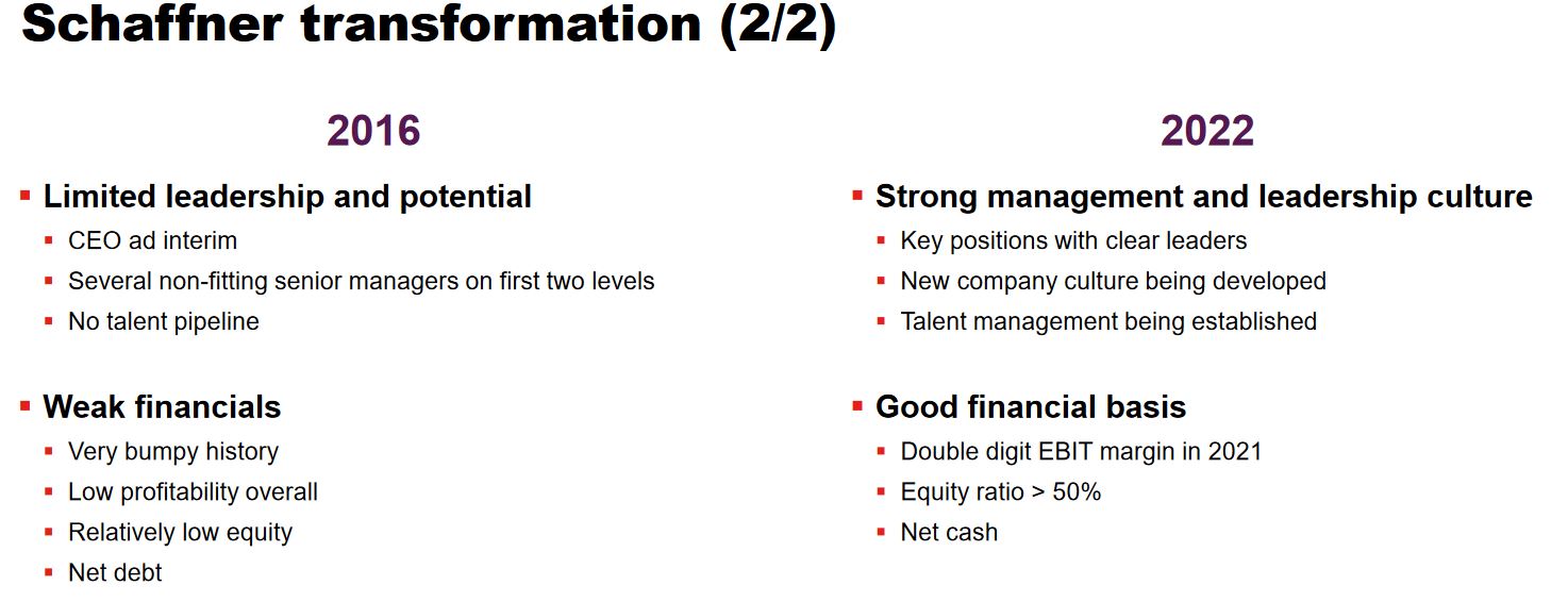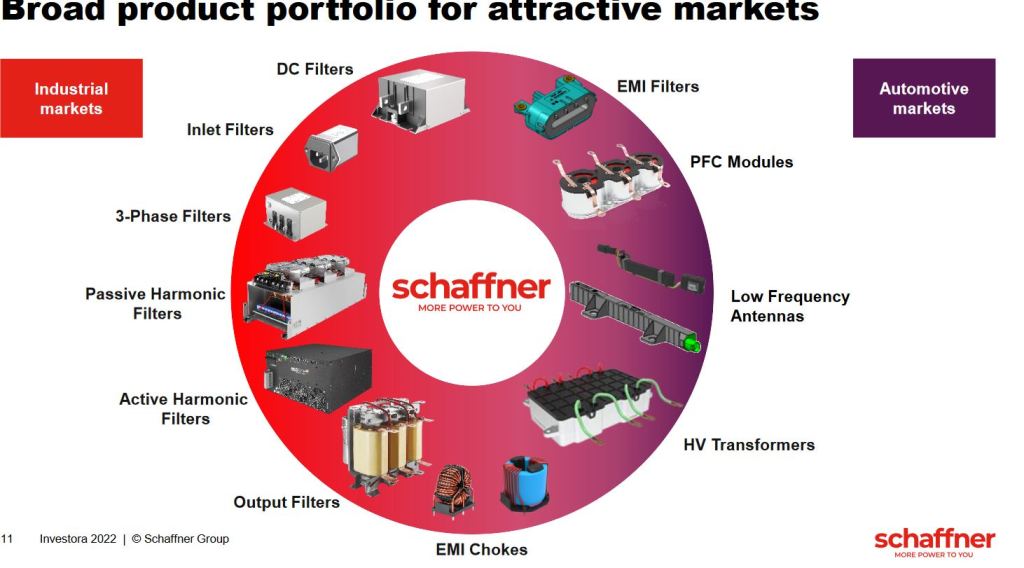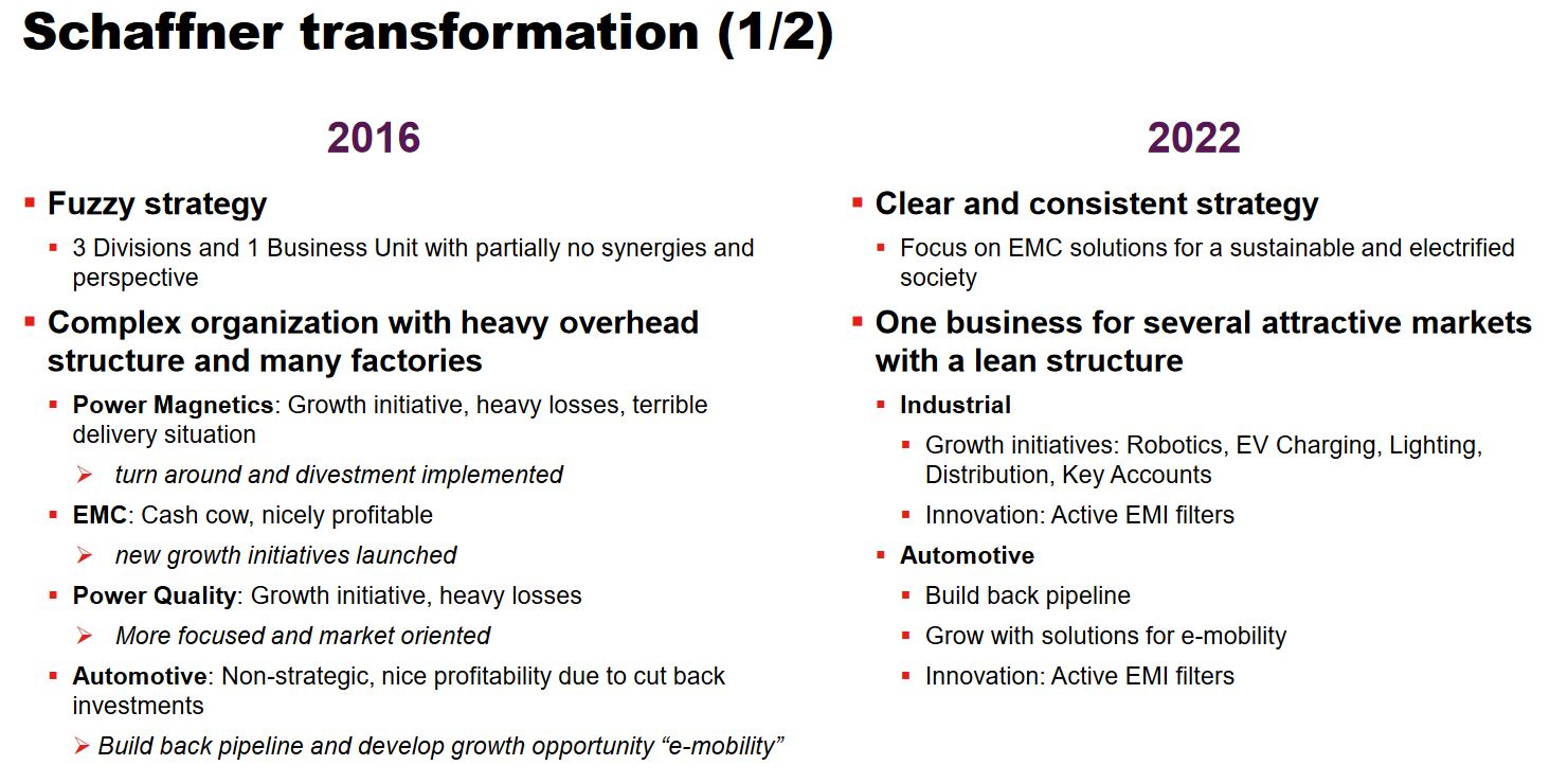 Schaffner Group is a Swiss company that underwent a significant tranformation over the past few years. Most importantly, they managed to dispose their second largest division “Power Magnetics” which was loss making in 2021 and focus on 2 divisions: EMI Filters and Automotive. This is how Schaffner describes their tranformation in a 2022 investor presentation: