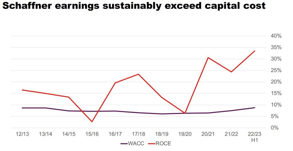 Schaffner had intitially guided mid term target of an EBIT-Margin of 10-12% and an organic growth rate of 5% p.a., both targets have been surpassed and they seem to be quite optimistic for the full year. This is supported by a very capital efficient bsuiness model with reaching 33% ROCE in the first 6M: