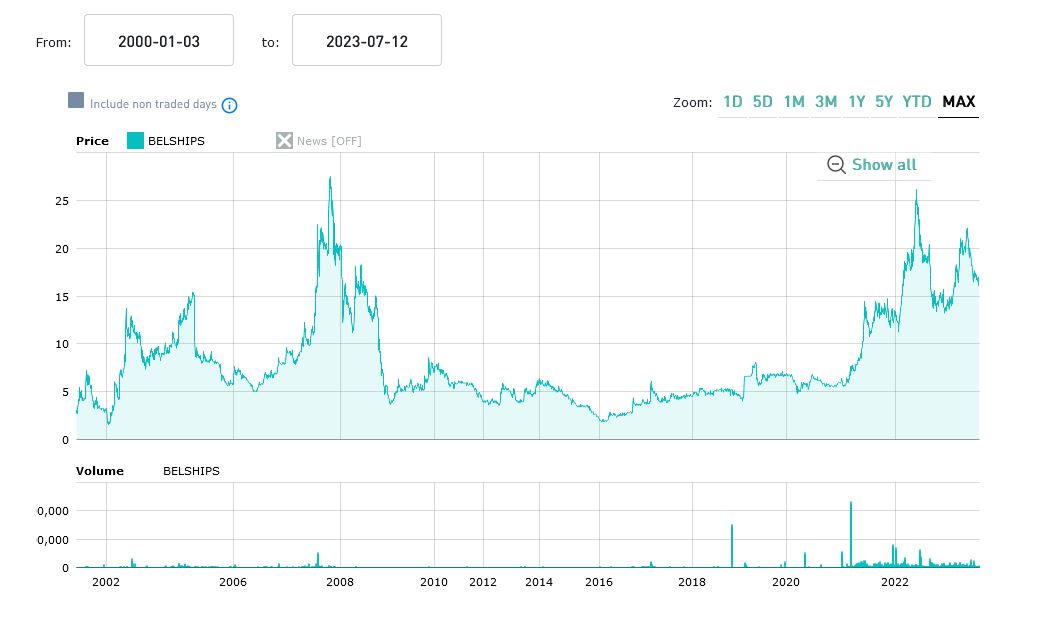 Belships is a 377 mn market cap ship owner that owns and runs a fleet of bulk carriers. As many other shipping companies, profits soared in 2021/2022 and the stock looks cheap with 6x trailing P/E. On the other hand, the chart shows that the business is cyclical and Q1 2023 earnings are already -50% below 2022.