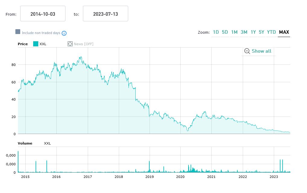 XXL is a 56 mn EUR market cap Sports retailer that has clearly seen better days as we can see in the stock chart:
