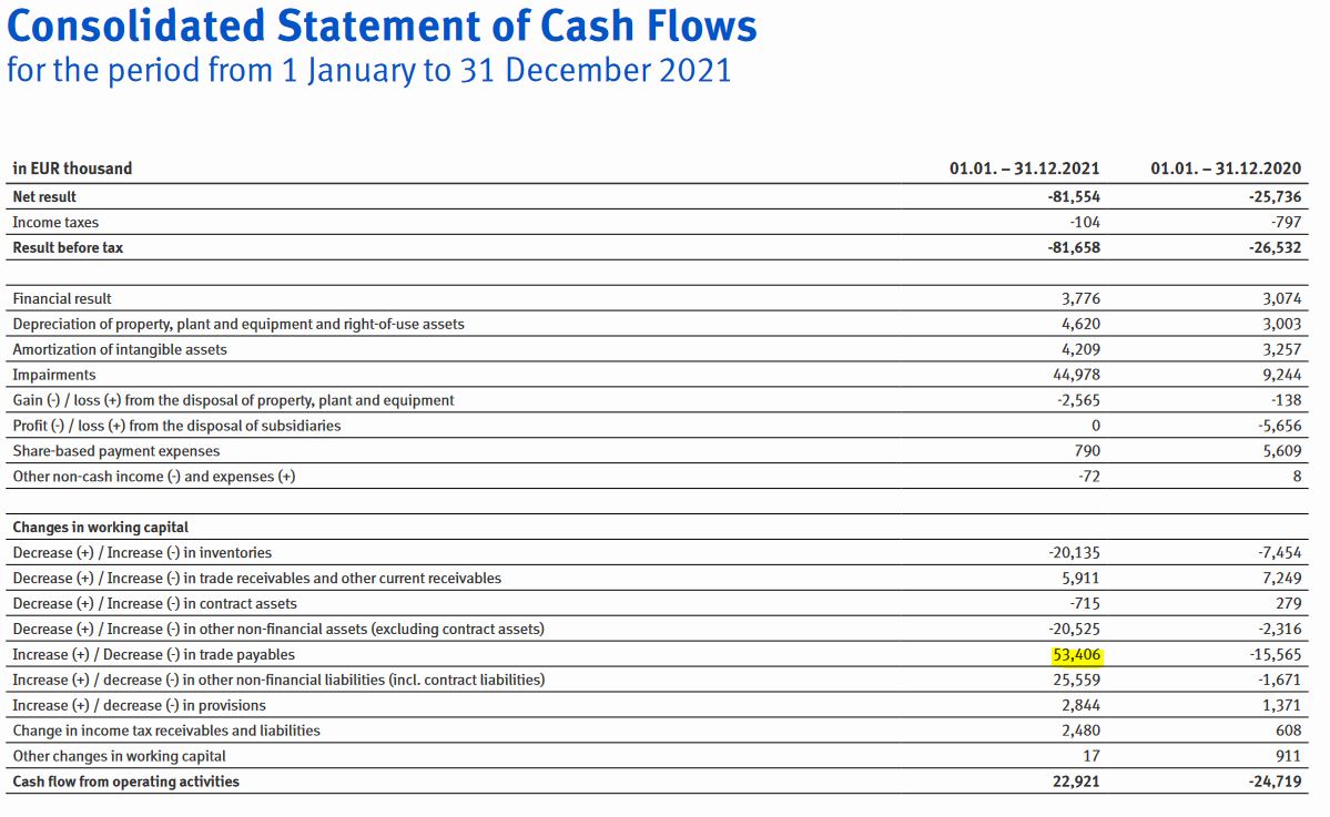 I have marked the biggest single Item that tturns the -80 mn net income into 22 mn positice Operating Cashflow, which is in this case a massive, 53 mn EUR increase in Trade payables.