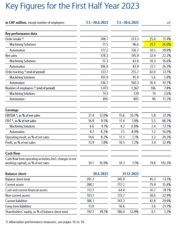 The company is clearly “dirt cheap” for a company that has een increasing sales by more than +20% in the first 6M of 2023 and EBIT/operating profit by more than +30%. However, if we look at all the key figures we can see that order intake in the machining segment already showed some weakness: