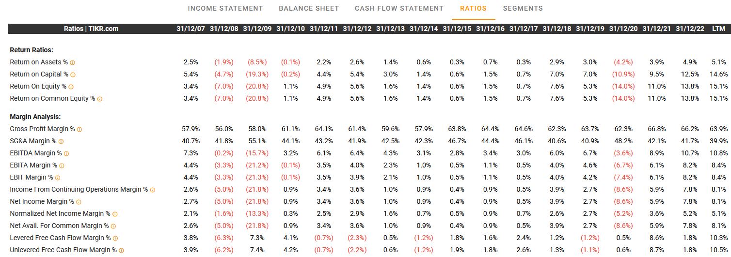 My main concern is that currently, margins and returns on capital are far above anything that has been achieved over the past 17 years or so as we can see on this TIKR page: