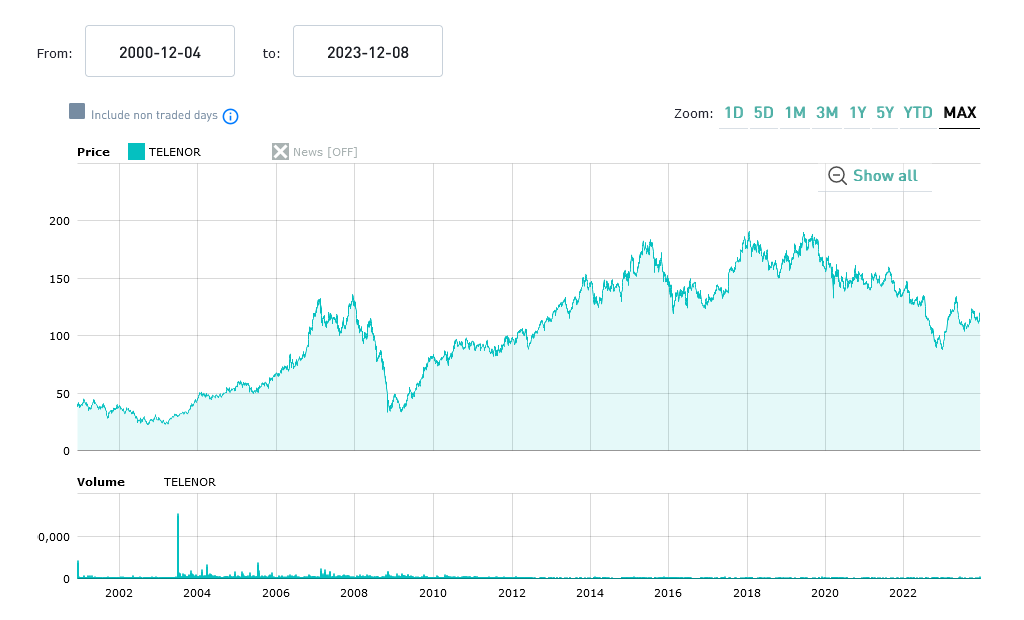 As many other Telcos, Telenor pays a pretty juicy dividend but the share price hasn’t done much over the past 15 years or so: