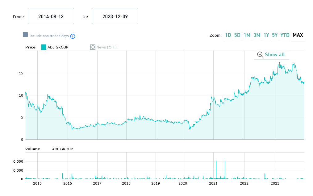 ABL Group is a 132 mn EUR market cap “investment holding company, provides marine and engineering consultancy services to the offshore oil and gas industry and renewables market worldwide”.
