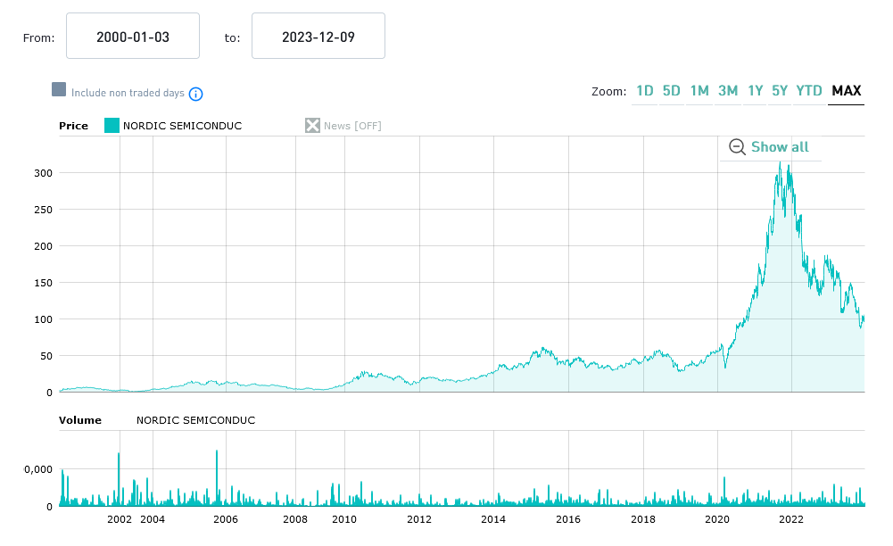 Nordic Semiconductor with a market ap of around 1,8 bn EUR “is a fabless semiconductor company specializing in wireless technology that powers the IoT”.