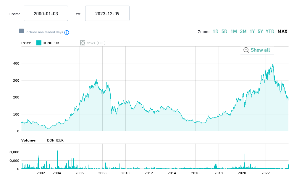 Bonheur is a 760 mn marakt cap company that “through its subsidiaries is involved in a number of activities in Norway and internationally. The investments are related to the following main segments: Renewable Energy, Wind Service and Cruise.”