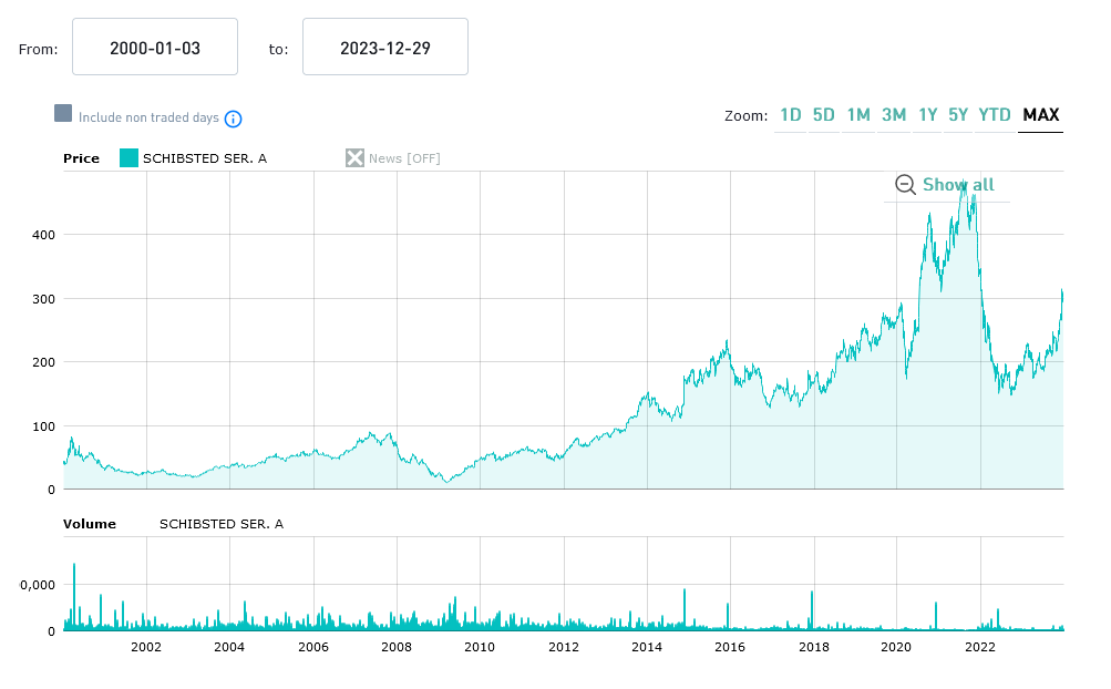 Schibsted has around 500 mn in debt, the remaining business (Nordic market places) seems to have a run rate of ~200 mn EUR per year. The share price has been on a wild ride, but long term value creation is very good.