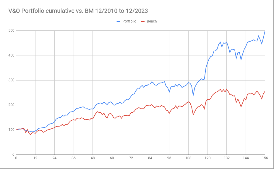 Over the 13 years from 12/31/2010 to 12/31/2023, the portfolio gained +398% against +120% for the Benchmark (before taxes). In CAGR numbers this translates into 13,2% p.a. for the portfolio vs. 6,2% p.a. for the Benchmark. The portfolio ended 2023 also with a new All-time-high. As a graph this looks as follows: