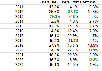 Sold positions: In 2023, I sold Meier Tobler, VEF, Rockwool, Recticel, Schaffner and Nabaltec. Temporary members were Scor and Broedr. Hartman (Special Sit). The current portfolio per 31.12.2023 can be seen as always on the portfolio page.