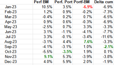 In relative terms, 2023 started pretty badly, as the portfolio underperformed the benchmark in the crazy January by almost -7%. The relative underperformance increased to almost -12% in July. Only in October, after 3 strong months and with the help of the Schaffner takeover, the portfolio matched the Benchmark: