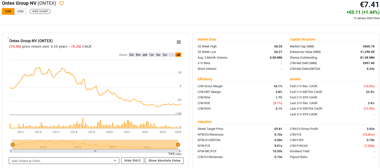 Ontex is a 610 mn EUR market cap that clearly has seen better days. Ontex produces “personal hygiene products and solutions for baby, feminine, and adult care in Belgium, the United Kingdom, the United States, Italy, France, and internationally.”