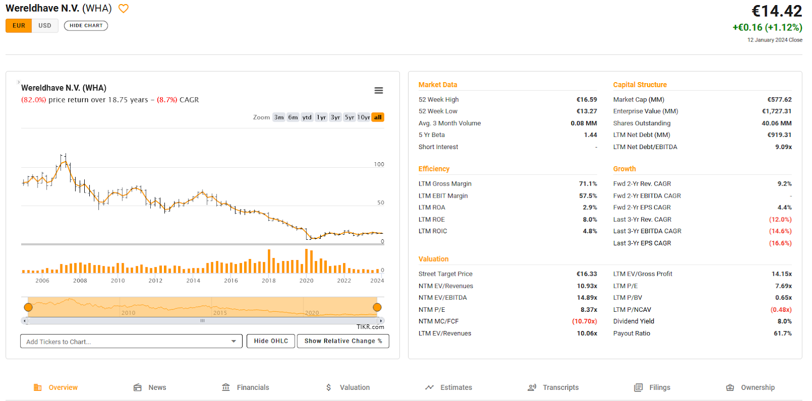 A first look at the TIKR overview page shows that the company is not too expensive at a P/E of ~20, but the share price has been doing nothing for 10 years or more.