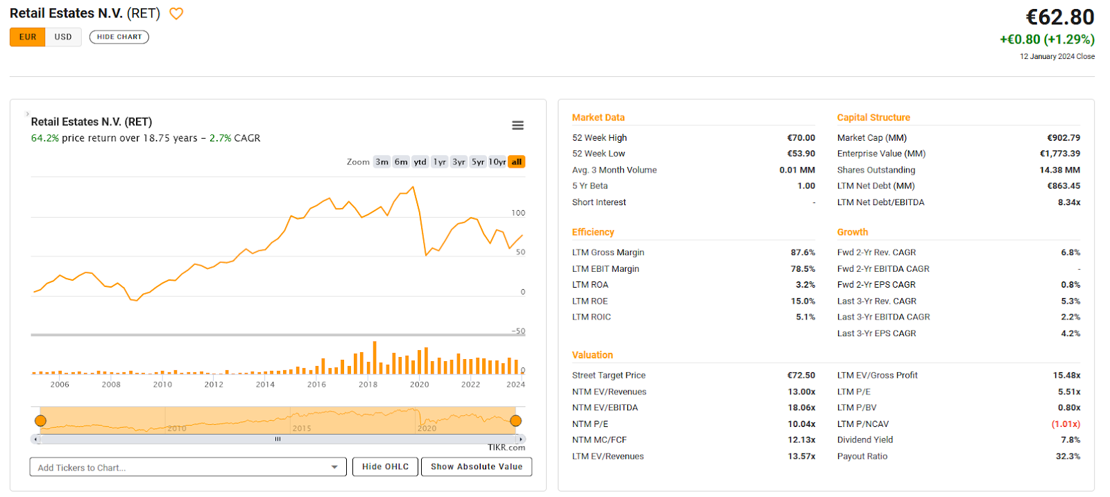 Wereldhave is a 577 mn EUR market cap operator of shopping malls. The stock chart doesn’t look pretty, Valuation based on P/E and dividend yield looks cheap.