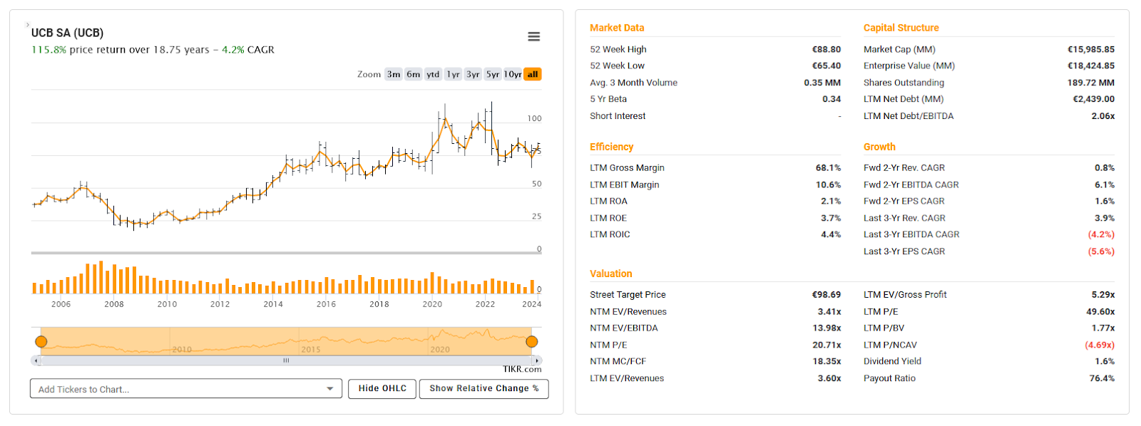 Looking quickly at the financials, UCB currently earns around 30-40% of its peak earnings from 2018 or 2012. Return on Capital is currently around 4%, down from a peak of 12-14%.