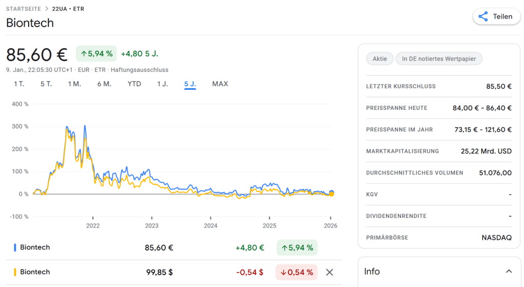 Before diving into the fundamentals, let’s look quickly at the stock chart: The share price in of Biontech has flatlined in USD and EUR.