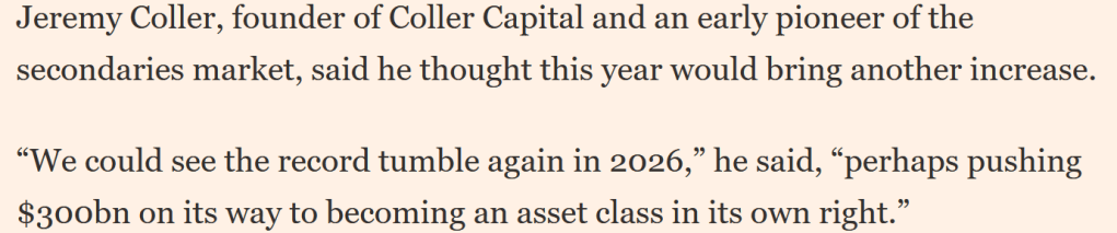 This is even more remarkable as fundraising for “primary” i.e. new funds has declined significantly in 2025. So secondaries are the only bright spot for PE firms at the moment.