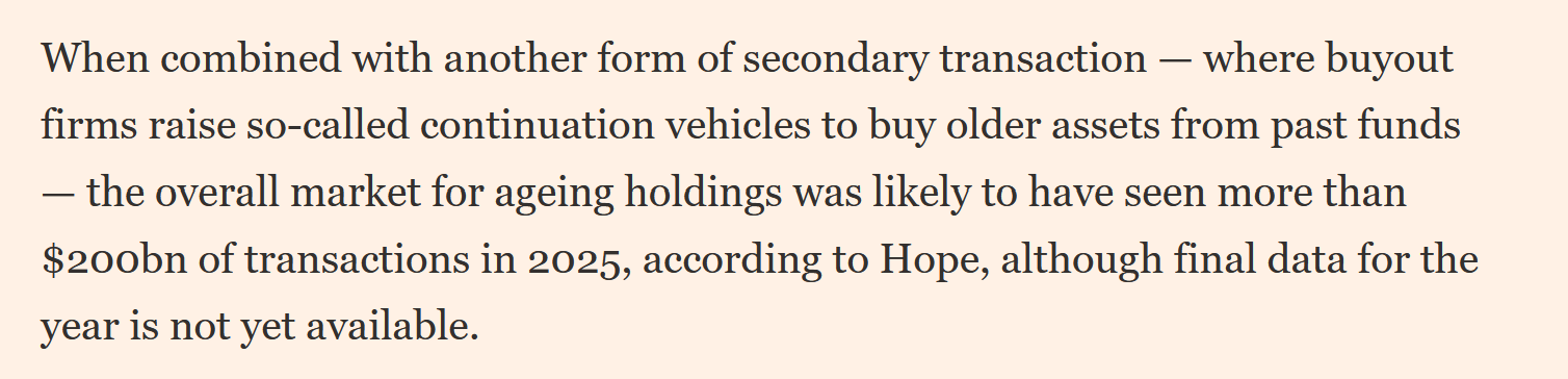 As those secondary transactions are also quite popular to juice up returns in the short run for retail PE structures (ELTIFS etc.), this is one more reason to stay away from those fee laden, intransparent structures.